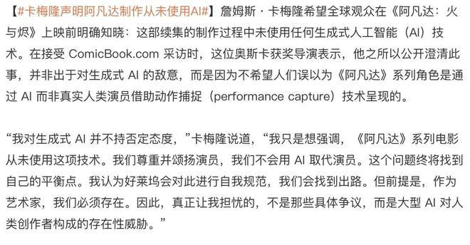 更难得的是,卡梅隆坚持不用 AI 替代演员,他认为表演捕捉是最诚实的表演形式,能捕捉到演员脸上每一个微小的表情变化,这是 AI 永远无法复制的。