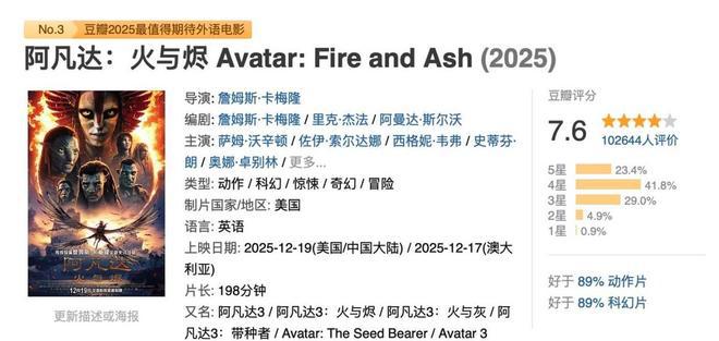 《阿凡达 3:火与烬》上映首周末直接点燃全球影市,中国内地票房狂破 4 亿,全球票房轻松迈过 1 亿美元大关,豆瓣评分稳坐 7.6 分高位。