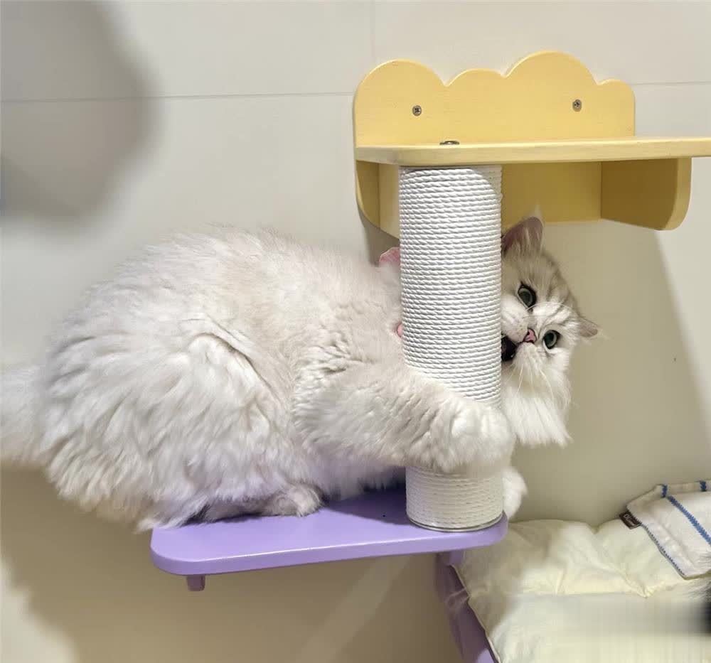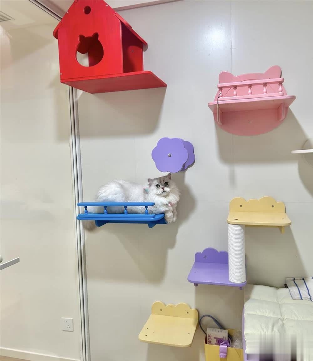 这各种颜色是姑娘买板材后自己涂刷的,位置随意安装,只要猫咪能跳跃玩耍就行,不得不佩服她的动手能力。