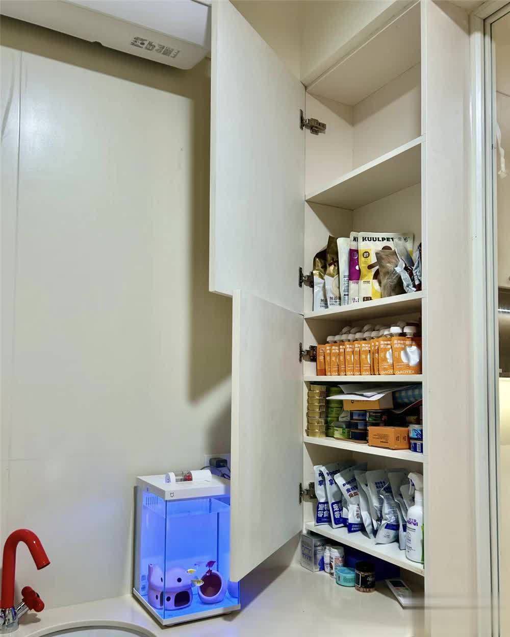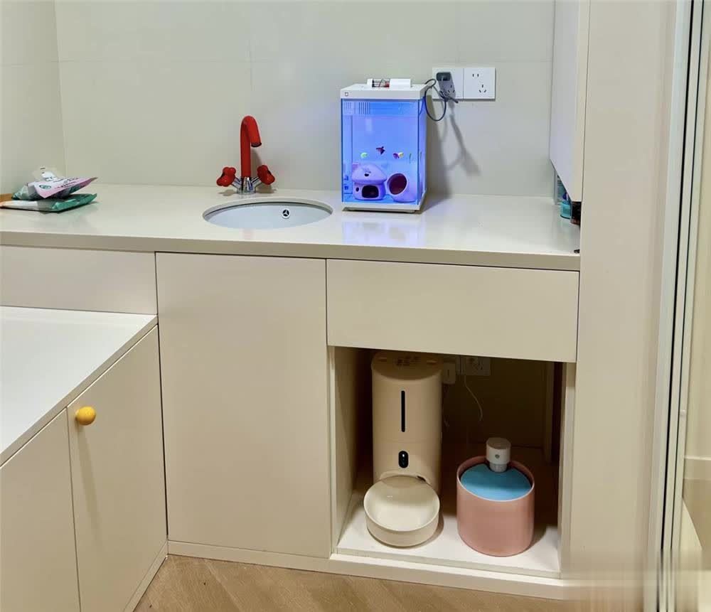 另一边柜子保留水龙头,底部留电位安装自动喂食机和自动饮水机,桌面还能放小水族缸,水槽可清理猫咪生活用品。